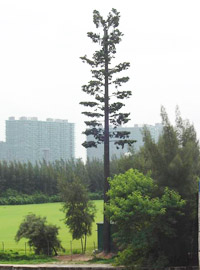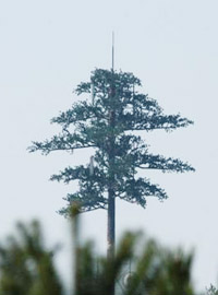 仿生通信塔,屬于通 信發(fā)射塔技術(shù)領(lǐng)域。是讓通信鐵塔與周圍的自然環(huán)境相協(xié)調(diào),有效地解決了風(fēng)景區(qū)等地建站難的問(wèn)題,其優(yōu)點(diǎn)是保持了原有單管塔的所有優(yōu)點(diǎn),在其外形上作了重大 的突破、改進(jìn),以自然生長(zhǎng)的松樹(shù),樟樹(shù)等為仿真的造型樣本,設(shè)計(jì)素描圖和電腦效果圖,制訂雕塑和噴涂工藝程序,對(duì)單管塔仿真?zhèn)窝b,使人們察覺(jué)不到塔的存 在,把它融入了周圍的自然環(huán)境中。