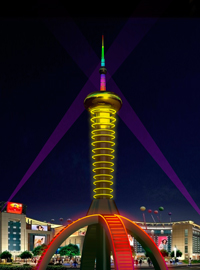 晚間,有各種追逐式循環(huán)彩燈或彩色射燈等,以襯托大廈、通訊塔的外型,并有美化夜景的功用。